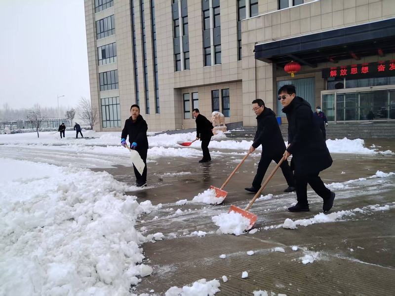 为确保道路畅通与生产安全,各部门员工不畏料峭春寒,手持除雪工具,齐心协力清扫主要通道上的积雪。