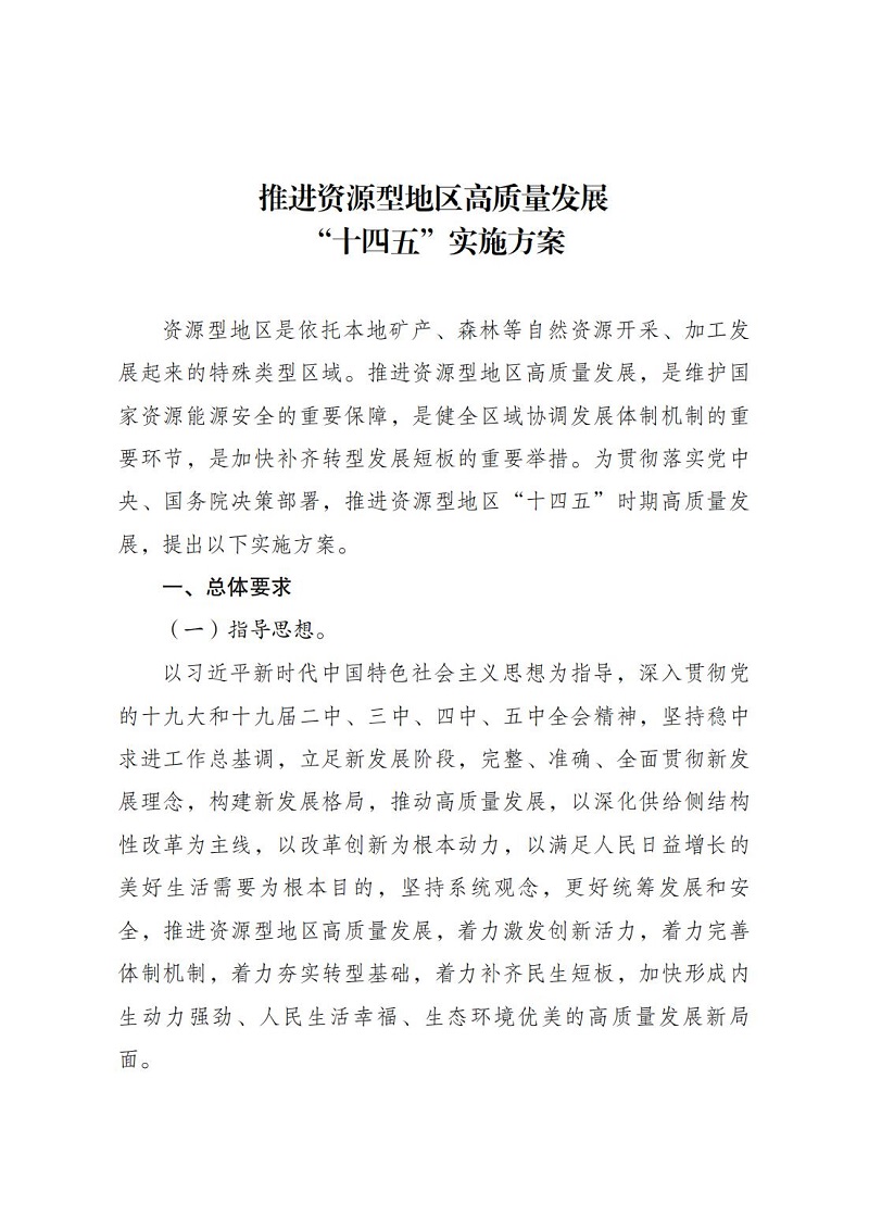 为贯彻落实党中央、国务院决策部署,推进“十四五”时期资源型地区高质量发展,经国务院同意,现将《推进资源型地区高质量发展“十四五”实施方案》印发给你们,请认真组织实施。