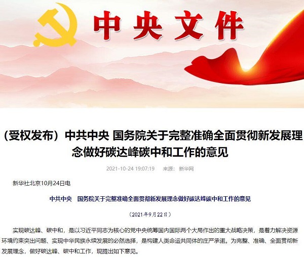 2021年9月22日,中共中央、国务院印发《关于完整准确全面贯彻新发展理念做好碳达峰碳中和工作的意见》。《意见》指出,开展钢铁、煤炭去产能“回头看”,巩固去产能成果;出台煤电、石化、煤化工等产能控制政策;未纳入国家有关领域产业规划的,一律不得新建改扩建炼油和新建乙烯、对二甲苯、煤制烯烃项目,合理控制煤制油气产能规模。严格控制化石能源消费,加快煤炭减量步伐,“十四五”时期严控煤炭消费增长,“十五五”时期逐步减少;统筹煤电发展和保供调峰,严控煤电装机规模,加快现役煤电机组节能升级和灵活性改造;逐步减少直至禁止煤炭散烧;加快推进页岩气、煤层气、致密油气等非常规油气资源规模化开发;推进煤炭、油气等市场化改革,加快完善能源统一市场。抓紧修订节约能源法、电力法、煤炭法、可再生能源法、循环经济促进法等。