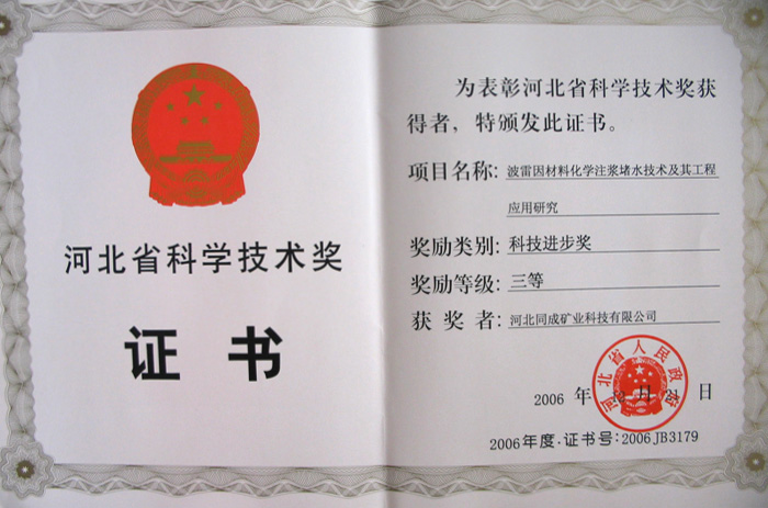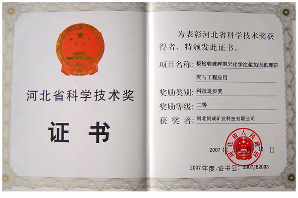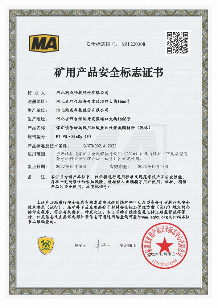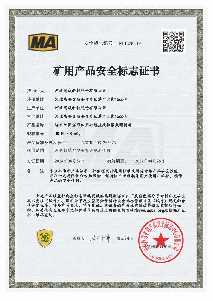 煤矿加固煤岩体用硅酸盐改性聚氨酯材料安标证书