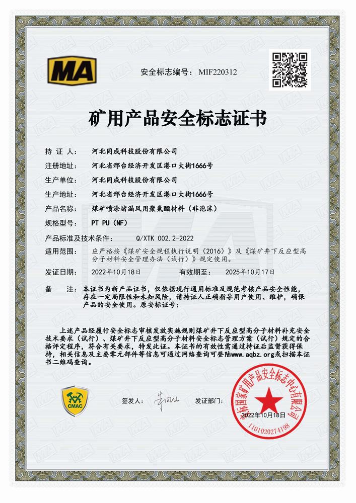 煤矿加固煤岩体用聚氨酯材料安标证书